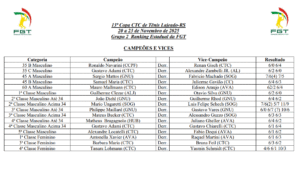 O evento que pontuou para o Grupo 2 do ranking estadual da FGT, foi disputado neste último final de semana no Clube Tito e Caça, em Lajeado e contou com a participação de mais de 150 atletas inscritos, em 16 categorias, com simples masculina e feminina.