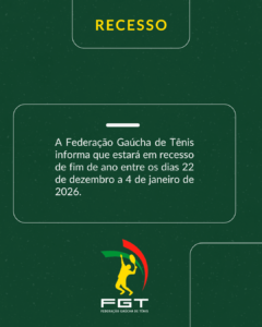 A Federação Gaúcha de Tênis informa que estará em recesso de fim de ano de 22 de dezembro a 4 de janeiro de 2026.