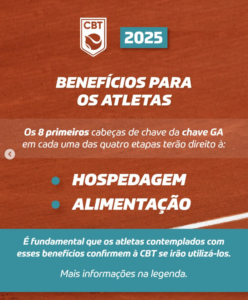 Os atletas participantes terão benefícios proporcionados pela CBT. Os oito primeiros colocados da chave GA de cada categoria terão hospedagem até o dia seguinte de suas permanências no torneio, além de alimentação. Para utilizar o benefício, os atletas contemplados precisam confirmar o uso do mesmo, conforme descrito nas informações de cada torneio.